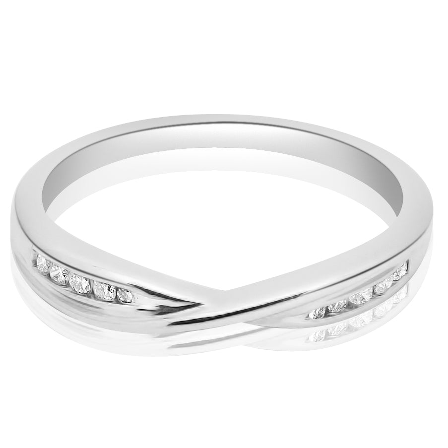 Alianza de matrimonio para ella con terminado cruzado, y 0.10 ct de diamante natural. Un modelo que embona perfectamente con anillos de compromiso no lineales. Disponible en oro blanco, rosa y amarillo 14K.