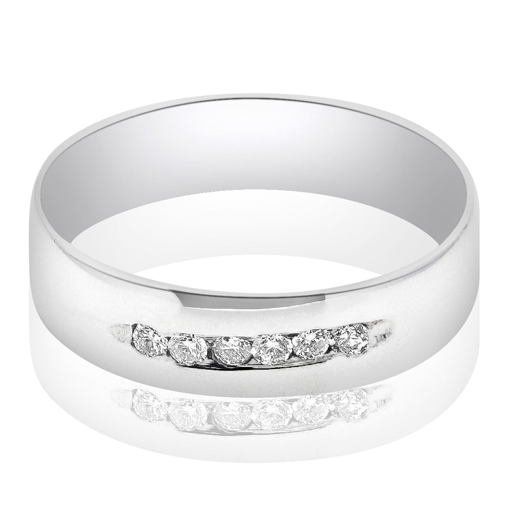 Alianza de matrimonio para caballero estilo media caña, con terminado liso espejo, y seis diamantes naturales para darle un toque especial (0.18 ct total). Disponible en oro blanco, rosa y amarillo 14K. Alianza sólida y con comfort fit para mayor comodidad.