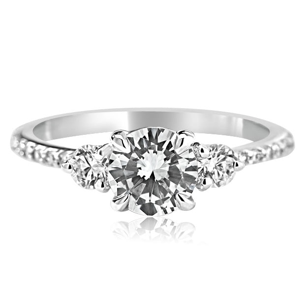 Montura para anillo de compromiso con dos diamantes laterales de 0.13 ct c/u (3.2 mm), y diamantes en pavé. Disponible en oro blanco, rosa, amarillo y platino. Precio únicamente de la montura, no incluye el diamante central. Grosor: 1.6 mm