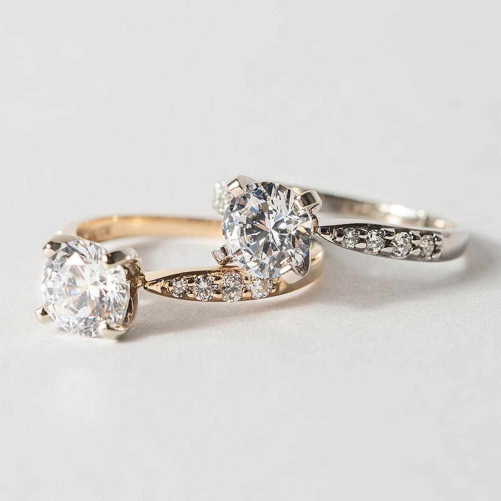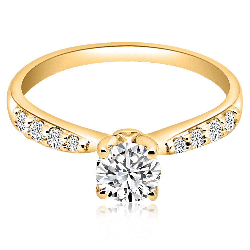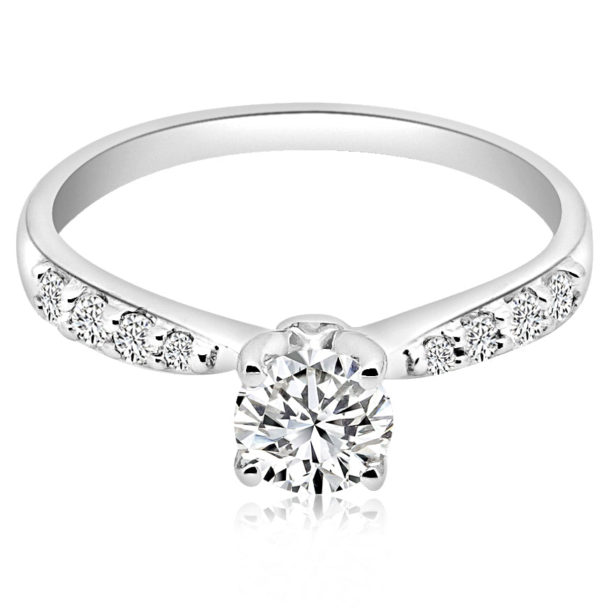Montura para anillo de compromiso con 0.15 ct de diamantes laterales montados a pavé (Estilo moño). Disponible en oro blanco, rosa y amarillo 14K ó 18K. (Precio únicamente de la montura, NO incluye el diamante central). Para elegir el diamante central, contacta a uno de nuestros #ExpertosEtuali.