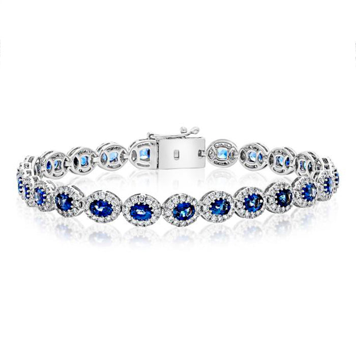 | Una joya con destello único. Encantador brazalete con 6 CTW de zafiros forma oval y 2.25 CTW de halo de diamantes. Disponible en oro blanco 14K. |