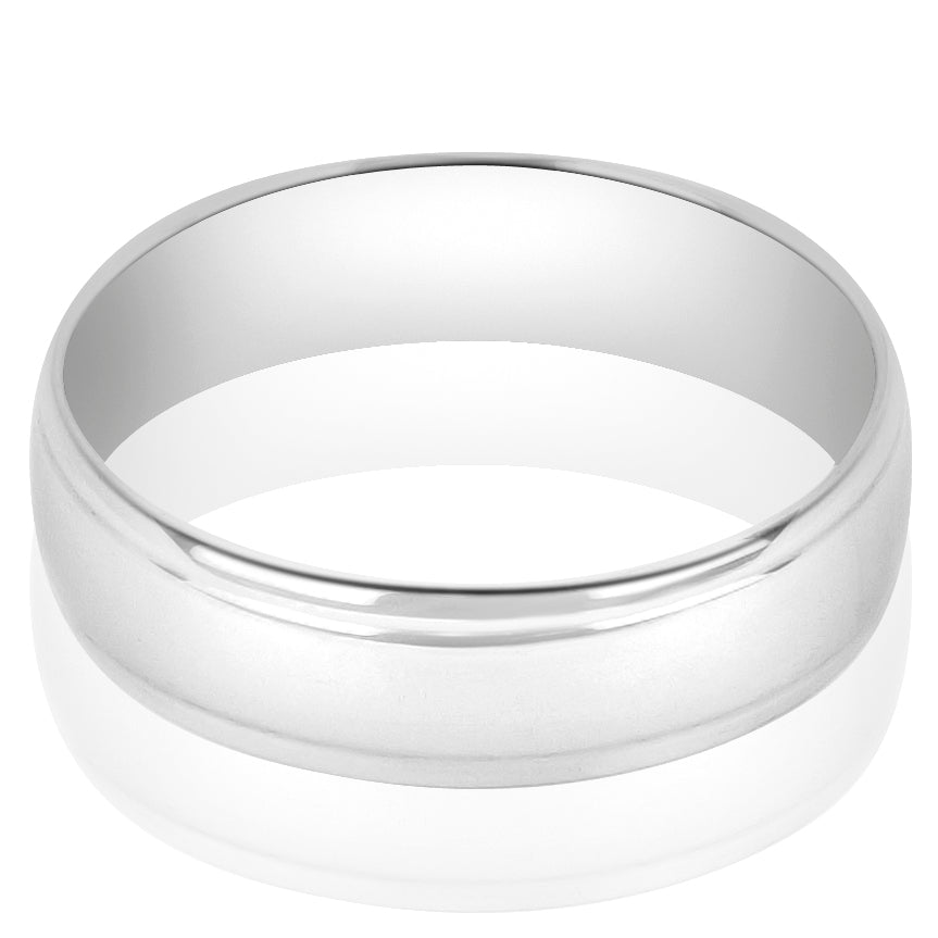 Alianza de matrimonio para caballero estilo lisa media caña, con dos franjas laterales que le dan un toque especial y único. Disponible en oro blanco, rosa y amarillo 14K. Alianza sólida y con comfort fit para mayor comodidad.