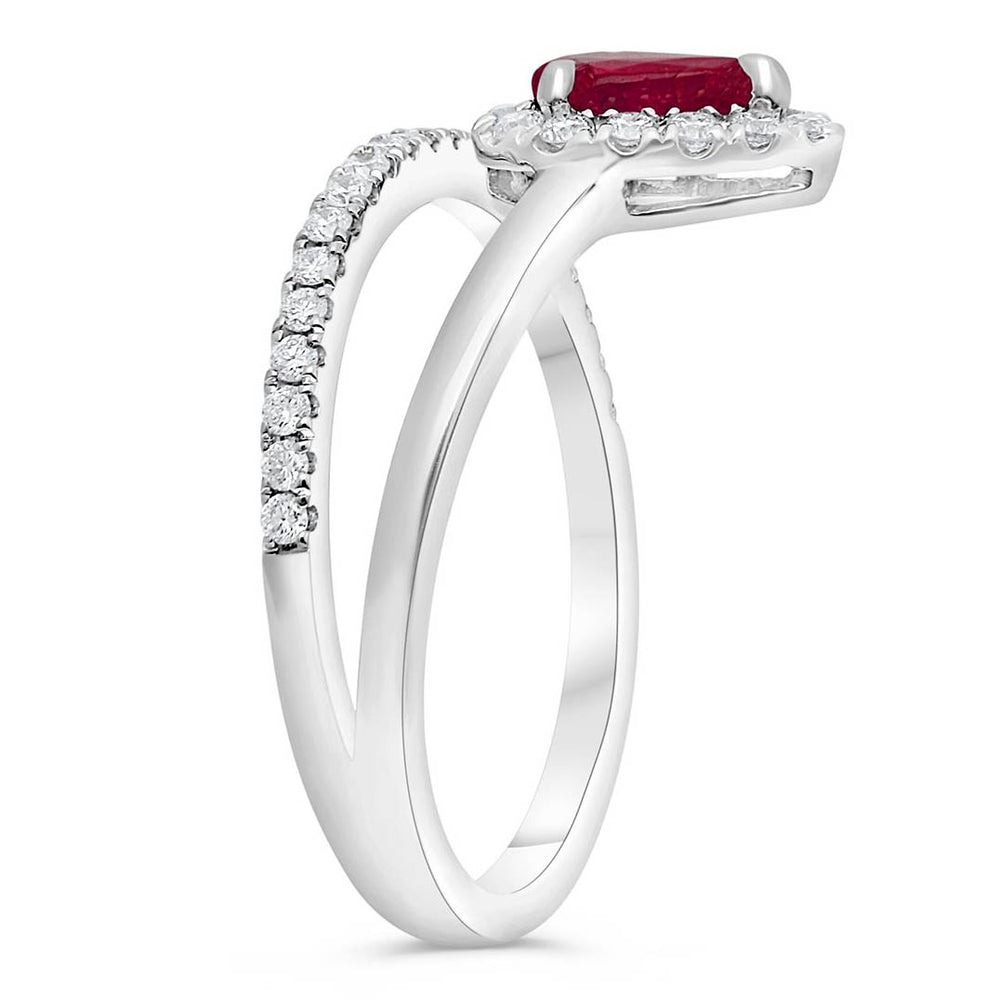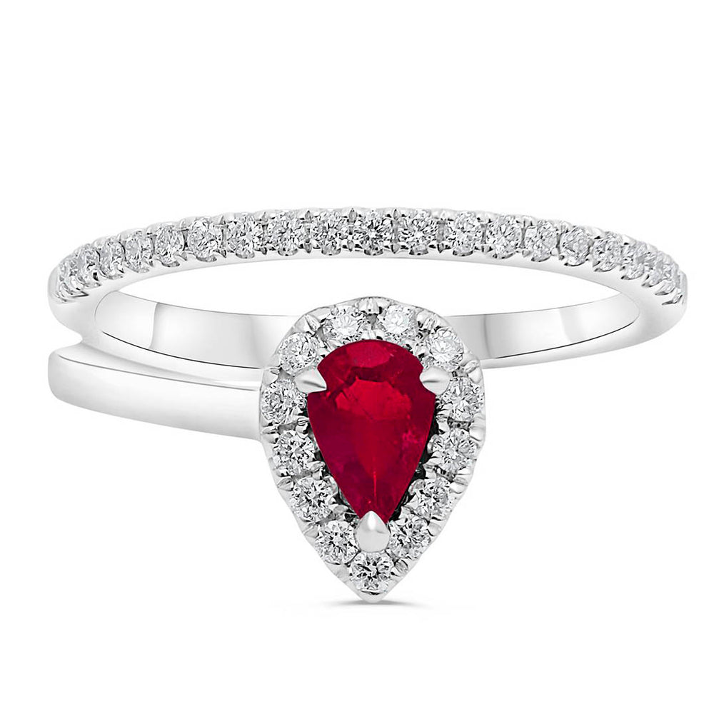 Una pieza única, con un toque atrevido y juvenil. Anillo con rubí en forma de pera, o gota, con halo de diamante natural. Disponible en oro blanco 14K.