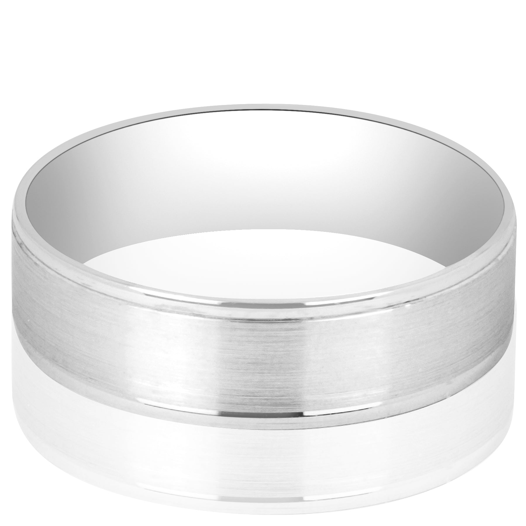 Alianza de matrimonio para caballero estilo mate plana, con dos franjas laterales lisas. Uno de nuestros modelos favoritos para caballero. Disponible en oro blanco, rosa y amarillo 14K. Alianza sólida y con comfort fit para mayor comodidad.