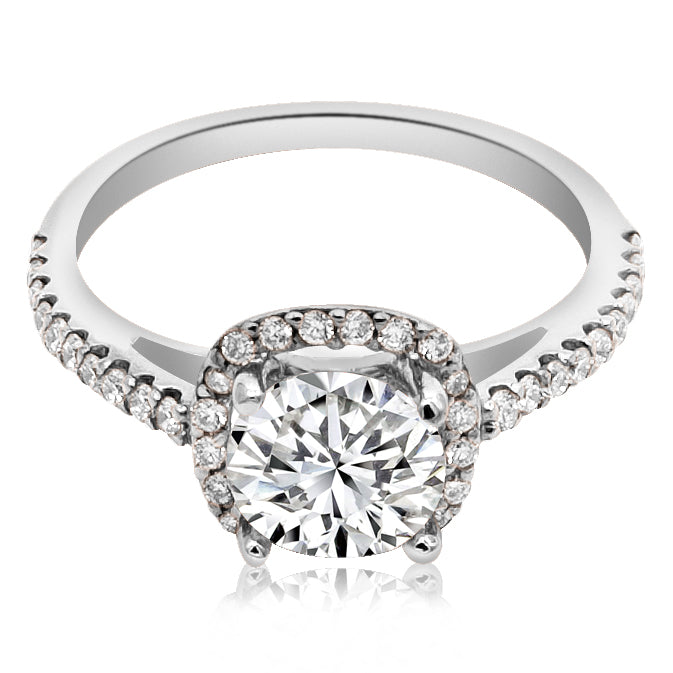 Montura para anillo de compromiso estilo halo cojín. Una excelente opción para realzar el brillo del diamante central. Disponible en oro blanco, rosa, amarillo, y platino.